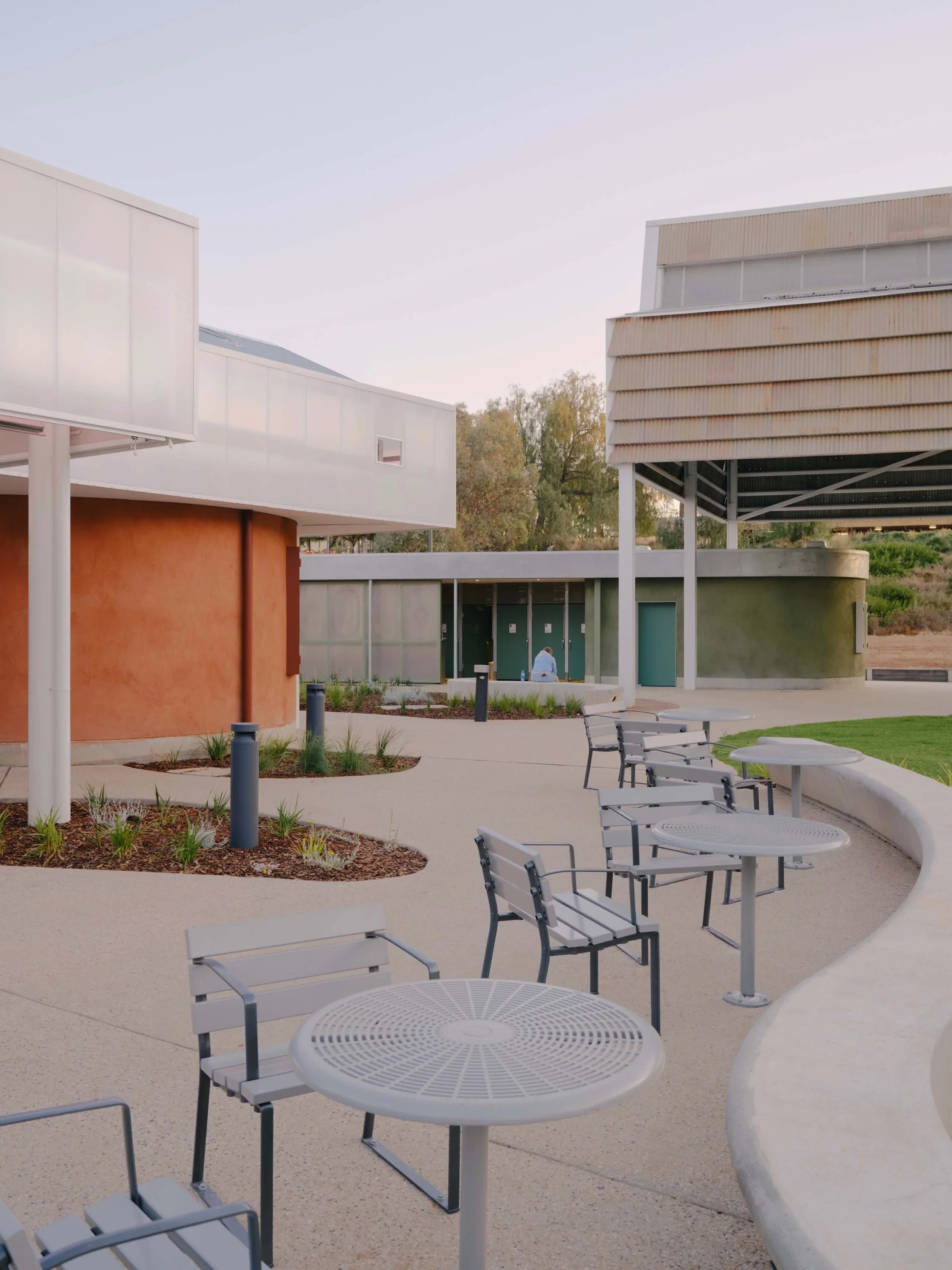 Este conjunto de edificios públicos en Victoria incluye cafetería, cocina comunitaria y aseos, todos construidos con cerramientos de hempcrete vertido in situ sobre entramado de madera. El proyecto obtuvo un premio nacional de sostenibilidad por su innovación material y por el carácter educativo de la obra.